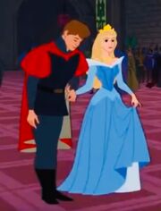 The pair go down to meet Aurora's parents and Phillip's father, and Aurora kisses King Hubert on his cheek before sharing a dance with Phillip. While the couple dance, Flora and Merryweather reignite their rivalry on their respective colors as the two bickering fairies relentlessly change the color on her dress with their magic. Aurora's dress keeps changing colors as she and Phillip continue dancing and share another kiss, with the final words in the book, below the illustration of the couple romantically kissing (and the color of Aurora's dress still changing from blue to pink) "and they lived happily ever after".